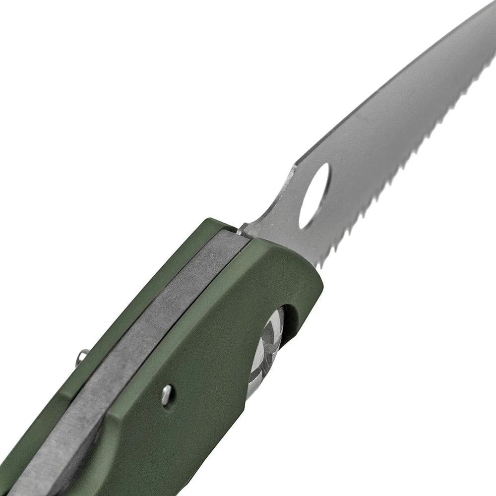 スパイダルコがこの機構なのは、壁に張り付いて3点保持をしている最中でもワンハンドでナイフを開けるようにであり、ブレードロックの機構は「ロックバック式」なので、使用中に不意に解除してしまうこともなく、安全で確実なロックが可能です。