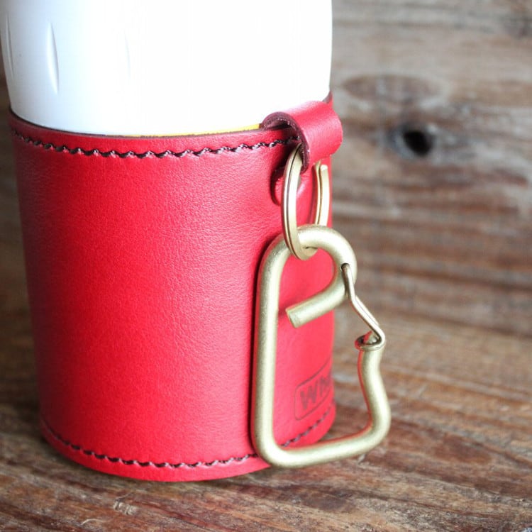 革タブをあしらい、使わない時は別売りの真鍮無垢ホルダーなどでザックやベルトループに引っ掛けられるようにしました。