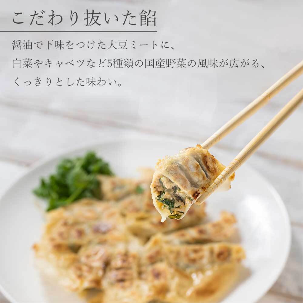 こだわり抜いた餡は醤油で下味をつけた大豆ミートに、白菜やキャベツなど4種類の国産野菜の風味が広がるくっきりとした味わい。動物性原料を一切使わず、たんぱく質や食物繊維を豊富に含み身体に優しい餃子です。国産のおからや無添加調味料を使い、安心して楽しめるヘルシーな餃子は 、健康にも地球環境にも配慮した新しいメニューです。