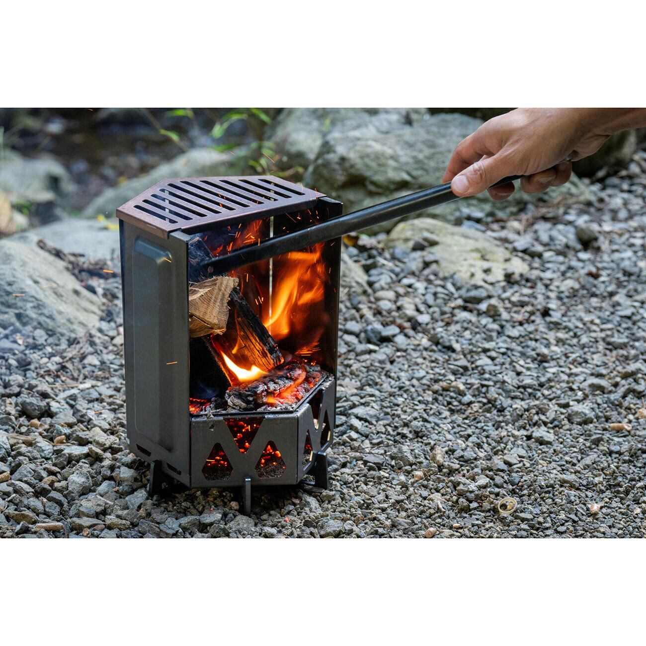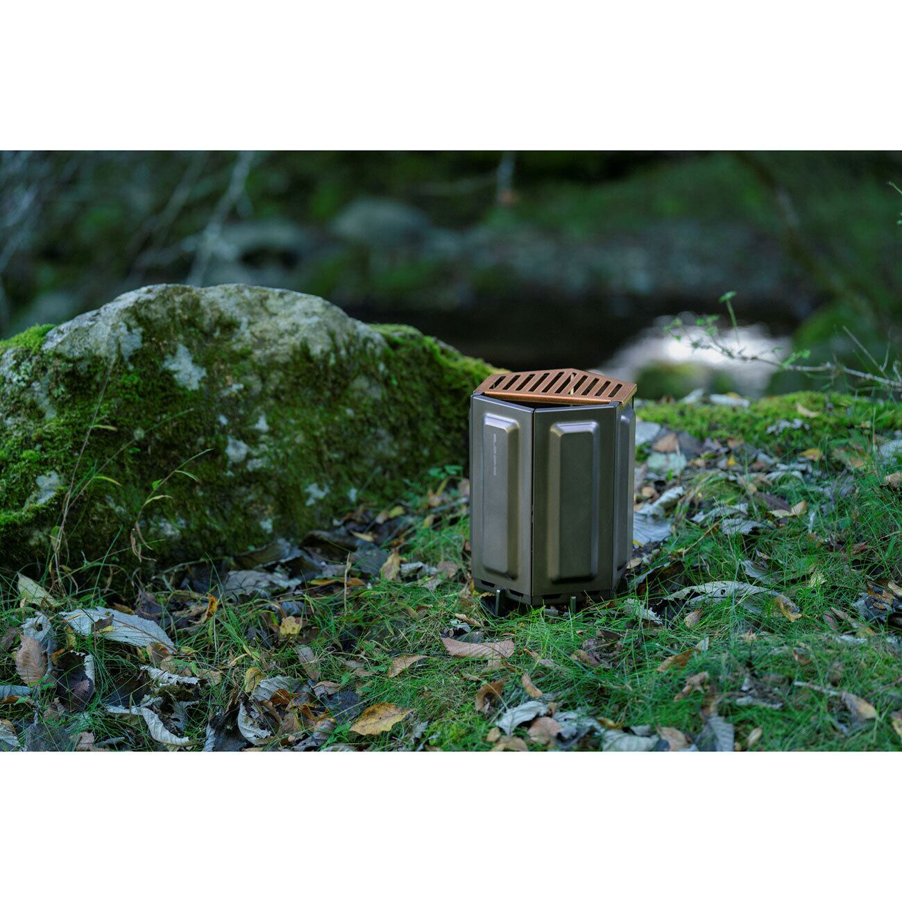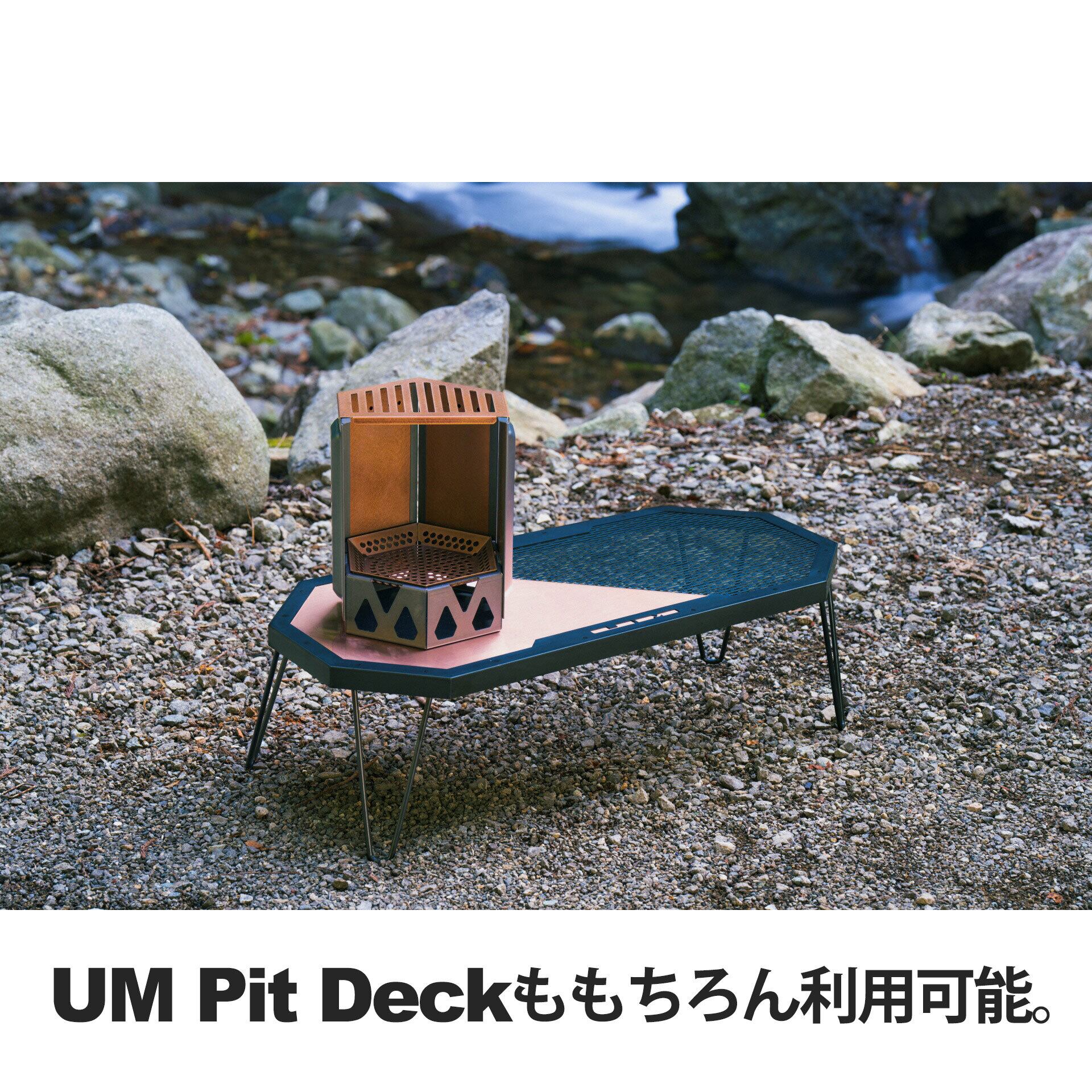 パネル脱着式の二次燃焼構造、パネルの風防兼リフレクター効果など、UM Fire Pitの特長はそのままに、コンパクトサイズでより持ち運びしやすくなった焚火台。