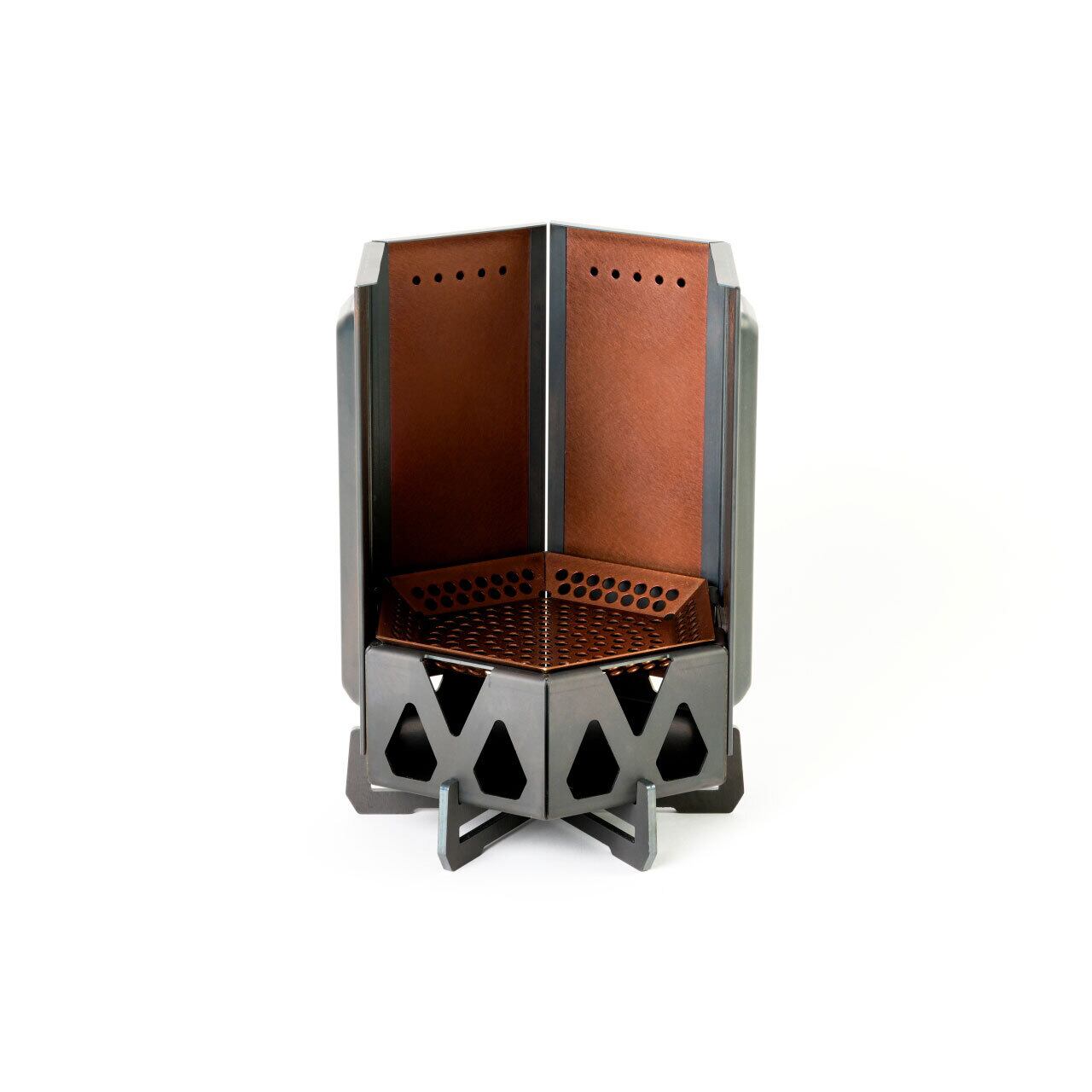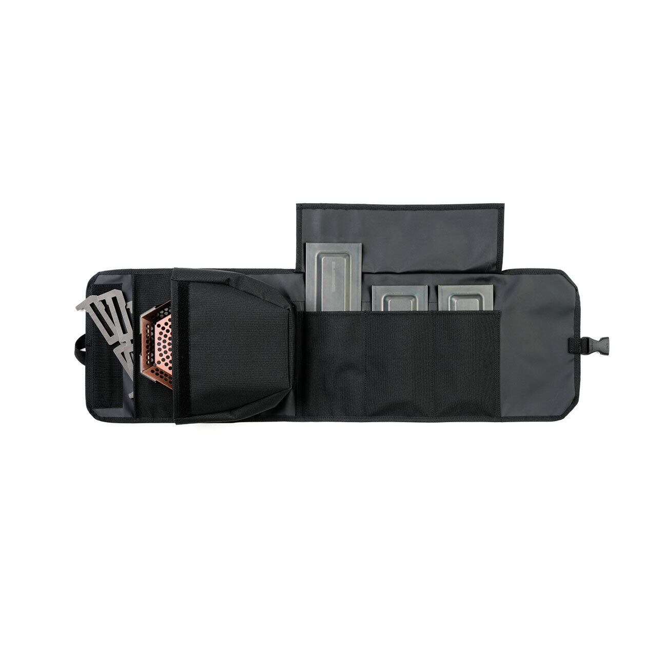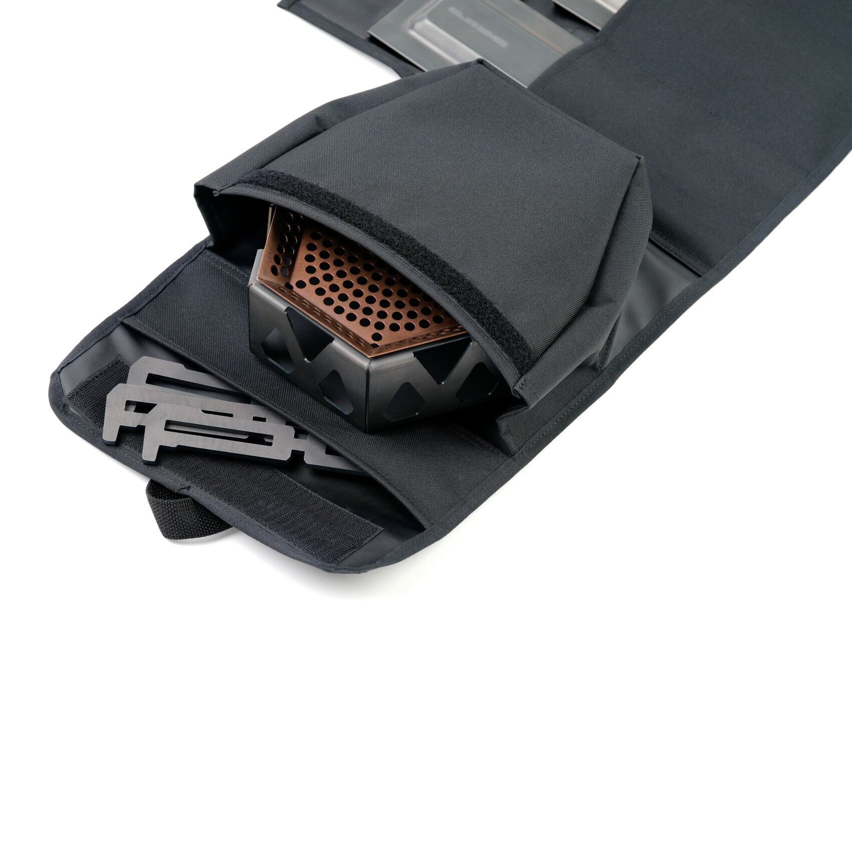 パネル脱着式の二次燃焼構造、パネルの風防兼リフレクター効果など、UM Fire Pitの特長はそのままに、コンパクトサイズでより持ち運びしやすくなった焚火台。