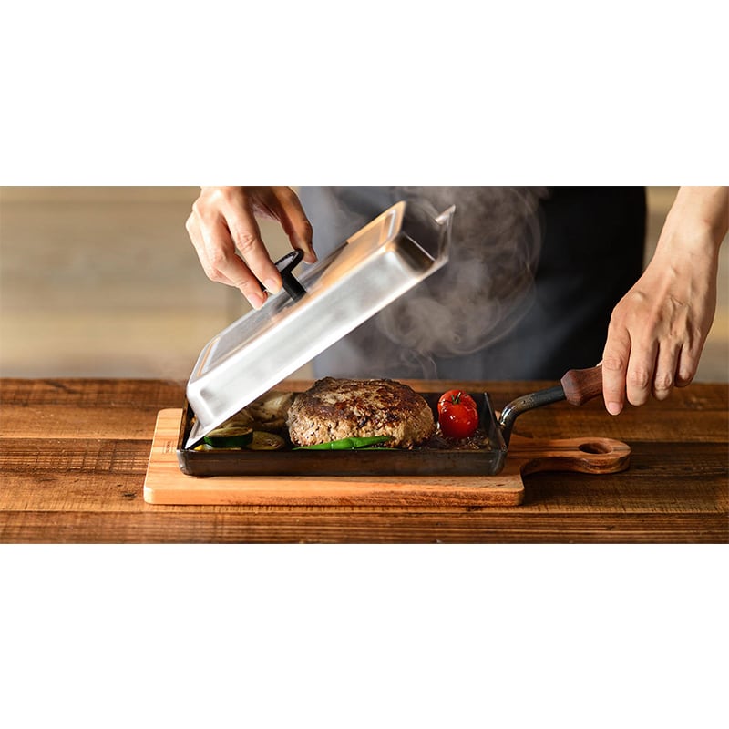 ポンドステーキがぴったり入る大きさです。蓋付きで、お肉以外にも海鮮や蒸し野菜も焼くことができます。