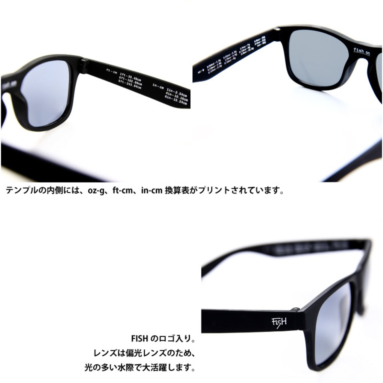デザインは釣り初心者にも優しいoz-g、ft-cm、in-cm換算表をテンプルの内側にプリント。外側はタギング調のデザインでシンプルに。ネオプレン製ロゴ入りケース付。
