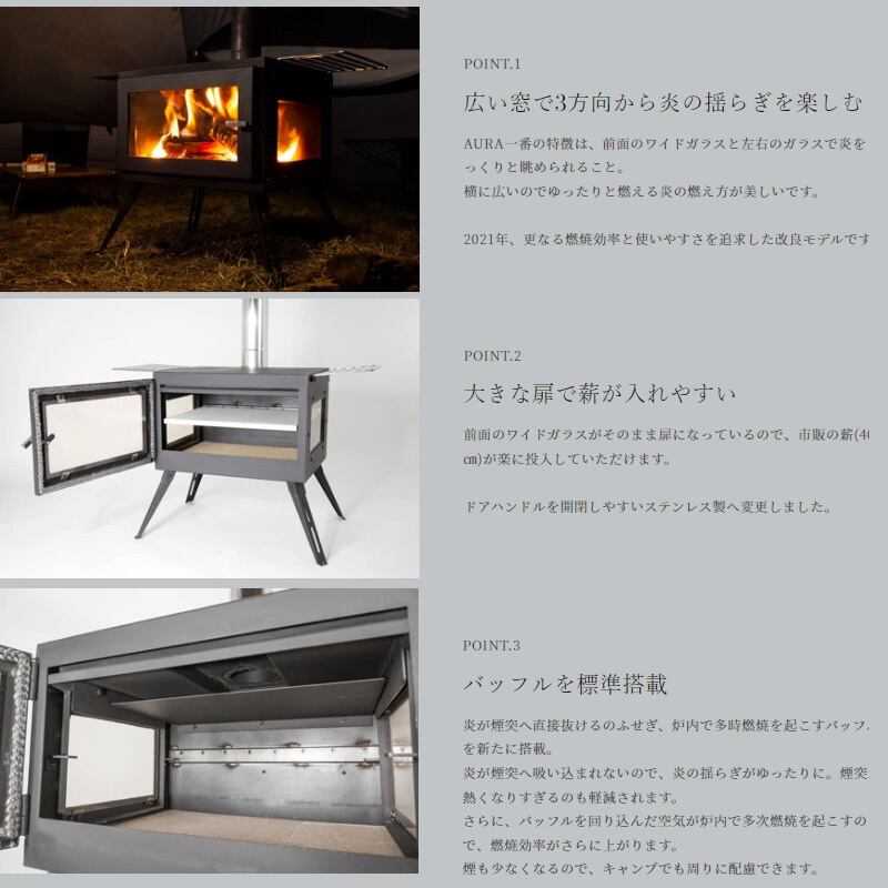AURA一番の特徴は、前面のワイドガラスと左右のガラスで炎をじっくりと眺められること。