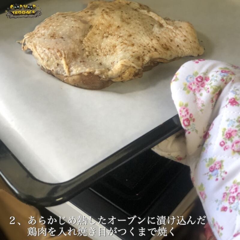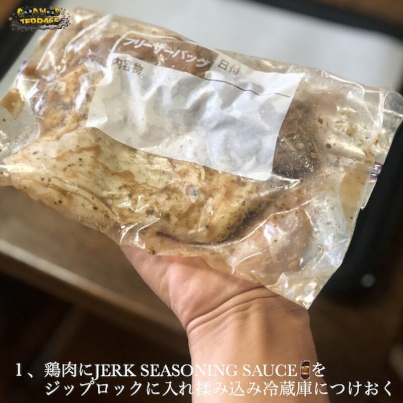 1.鶏もも肉、約200gの水気をキッチンペーパーで取りジップロックで、ジャークシーズニングソースを中さじ2杯を揉み込む
