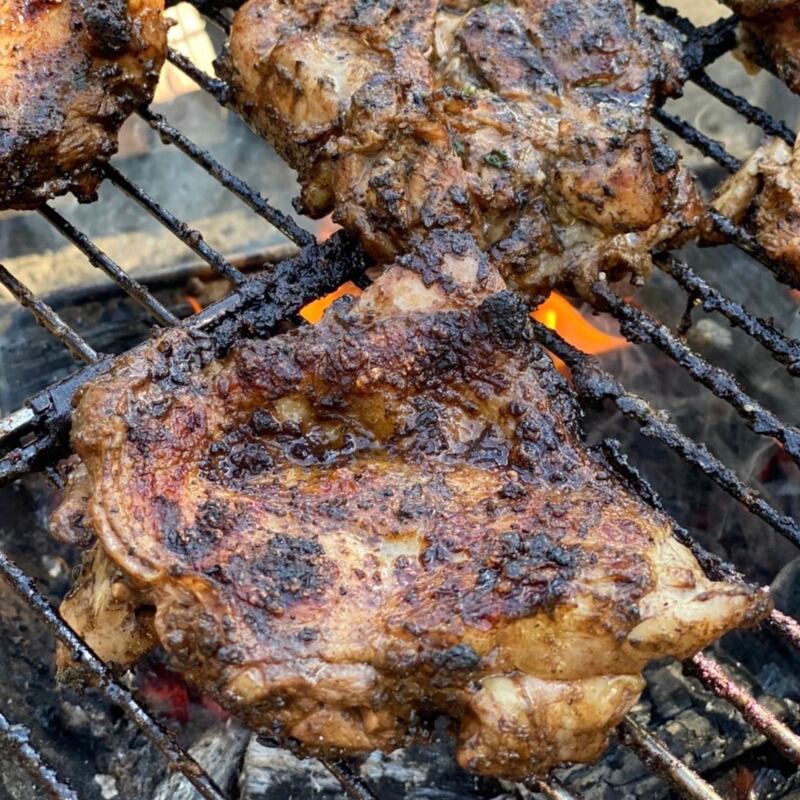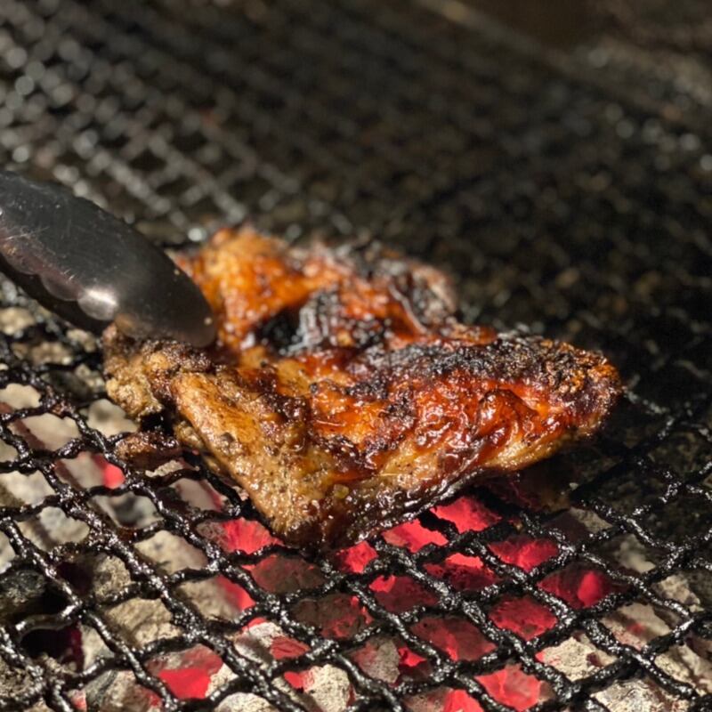 鶏肉や豚肉にシーズニングソースを漬け込み炭火で焼けば、