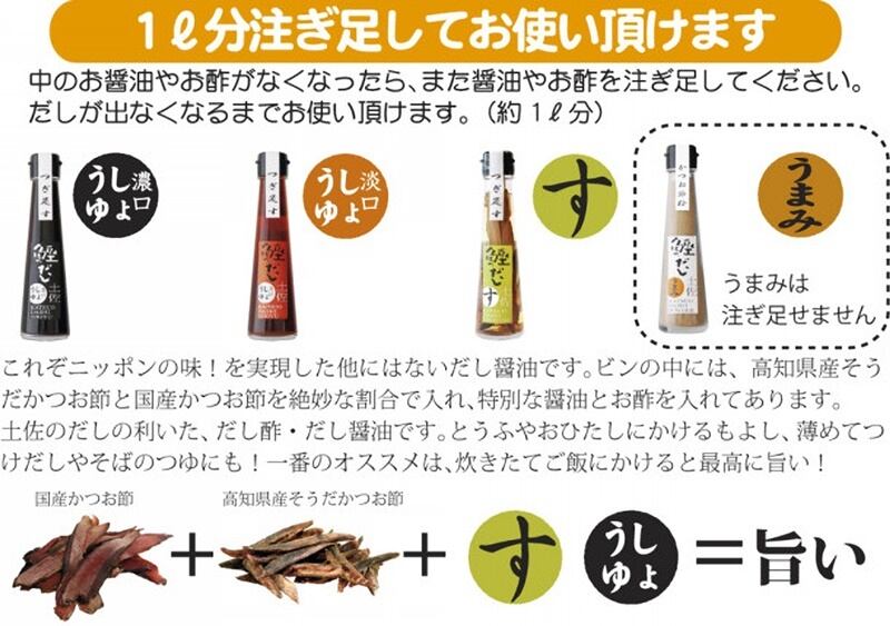 ●原材料名 醤油(本醸造) 淡口醤油(混合醤油) 米酢 かつお削りぶし(厚削り) そうだかつおぶし (すべて国産)