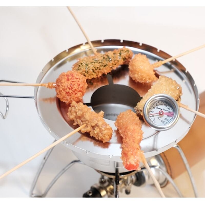 油の温度確認の為、ハニーウェアに協力頂いた揚げ物用温度計を標準装備。