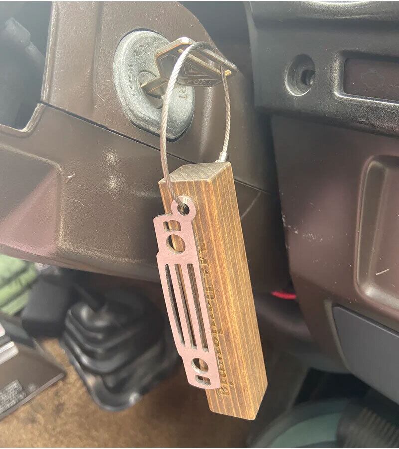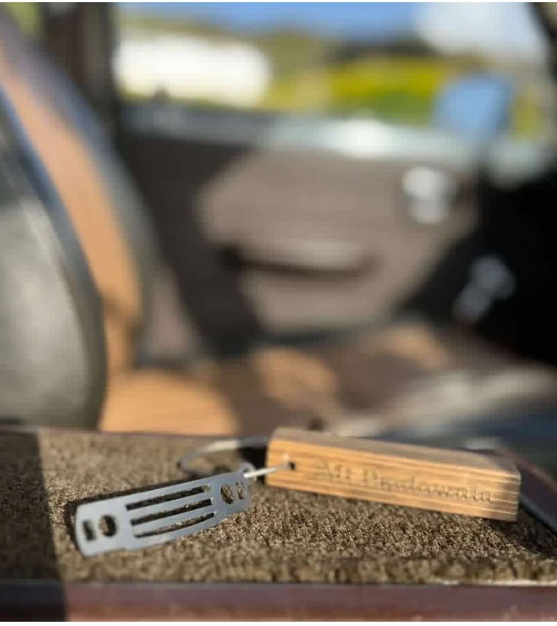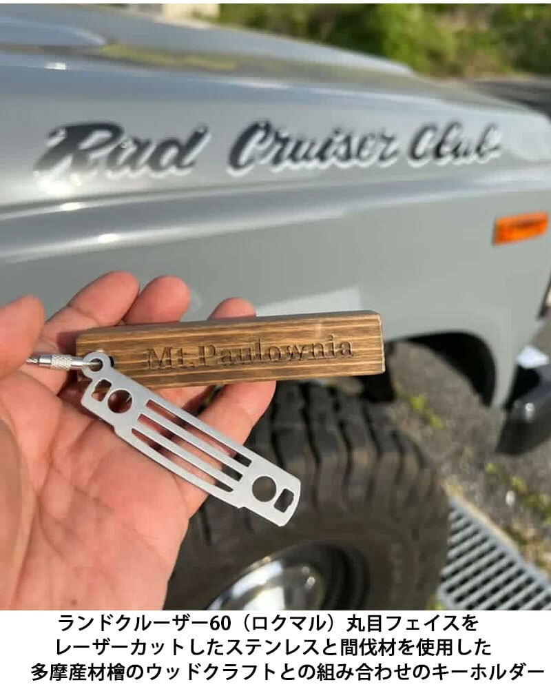 ランドクルーザー60(ロクマル)丸目フェイスをレーザーカットしたステンレスと間伐材を使用した多摩産材檜のウッドクラフトとの組み合わせのキーホルダー。