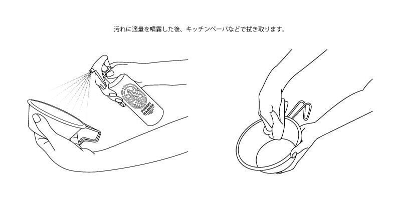 汚れに適量を噴霧した後、キッチンペーパなどで拭き取ります。