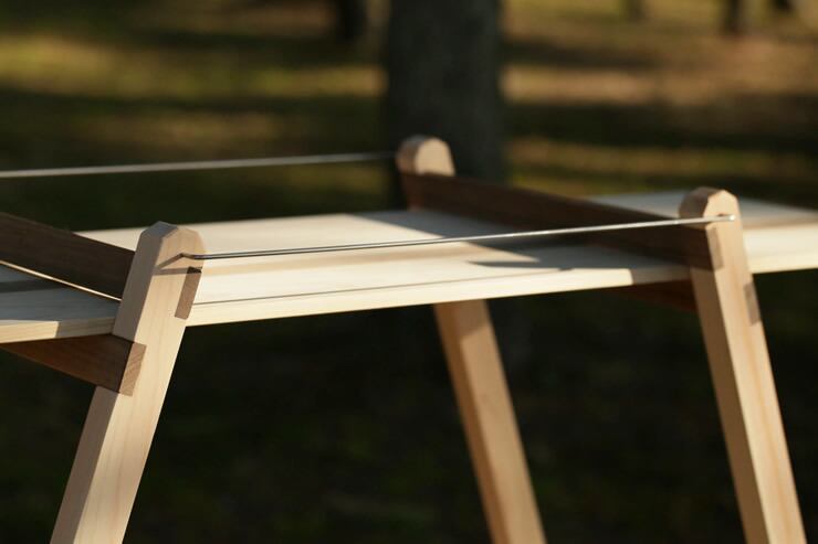 収納時には棚板を足のブリッジの間へ差し込める設計。スッキリした見た目と収納性を両立しました。
