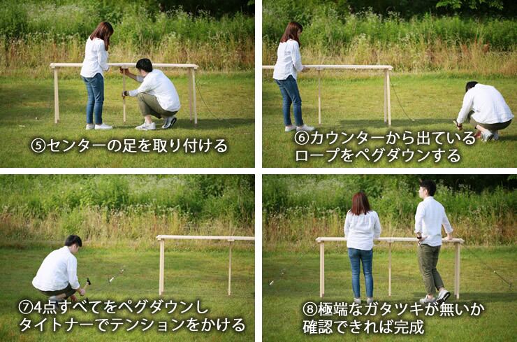 自立しているテーブルを倒れなくするためにテーブル端にロープを装着してペグダウンすることでいままでのハイカウンターに無い安定感を獲得しました!